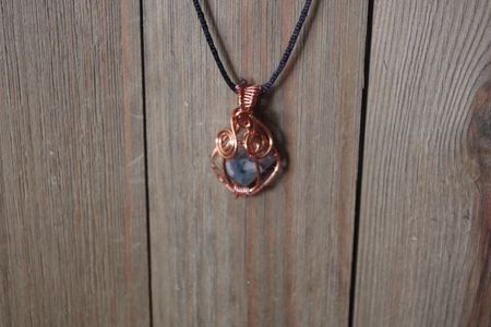 A square moss agate cabochon wrapped in copper on a satin cord.