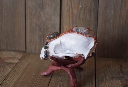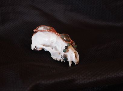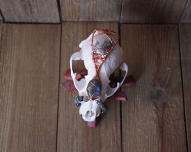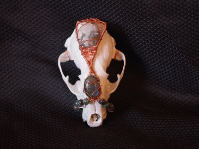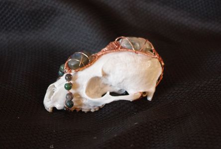 1 savesRaccoon skull, painted and sealed and wrapped in copper with labradorite and moss agate cabochons and moss agate and silver sheen obsidian beads.