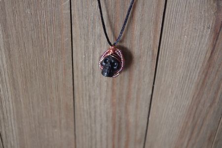 0 savesObsidian skull carving, copper wire, and glass beads.